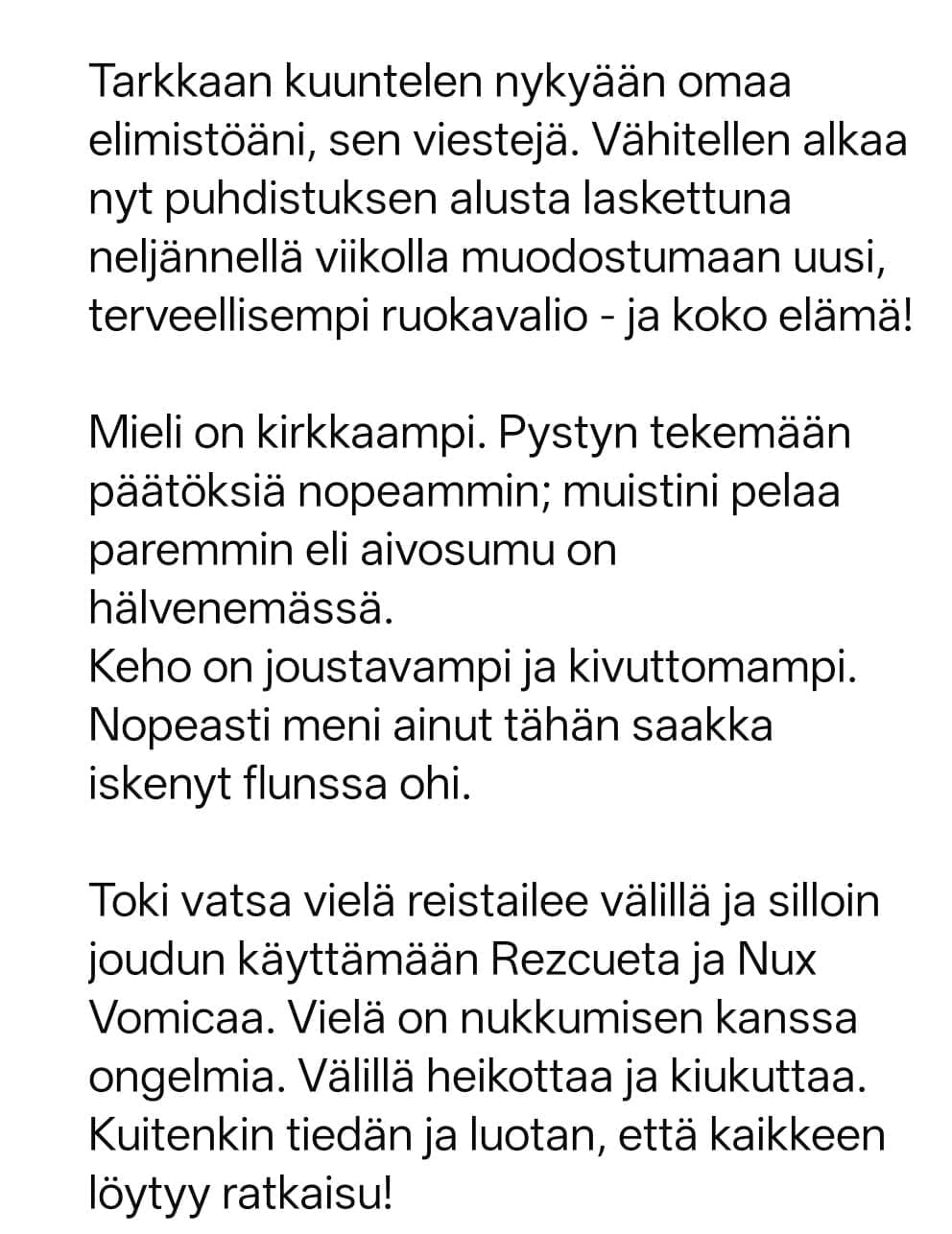 Kun keho laskee kierroksia, myös turvotus, kipuilu, ripuli tai ummetus voivat alkaa helpottua ja olo kirkastua.